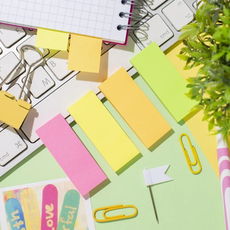 Клейкие закладки легко удаляются, не оставляя следов и не повреждая бумагу.