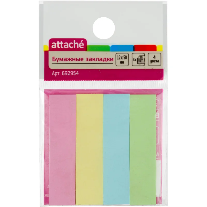 Клейкие закладки бумажные Attache 4 цвета, 12х50 мм, 100 листов