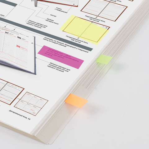 Набор пластиковых закладок 4 неоновых цветов размером 45х12 мм и 45х25 мм состоит из 100 листов, по 25 закладок каждого цвета. Клейкий слой - 22 Н/м. Легко клеятся к любой поверхности и не оставляют следов. Материал закладок позволяет делать надписи ручкой и карандашом. Уложены на пластиковом основании. Поставляются в полиэтиленовом пакете с европодвесом.