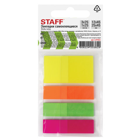 Клейкие закладки бумажные Staff 45х12мм, 3 цвета по 25 листов, 45х25мм, 25 листов