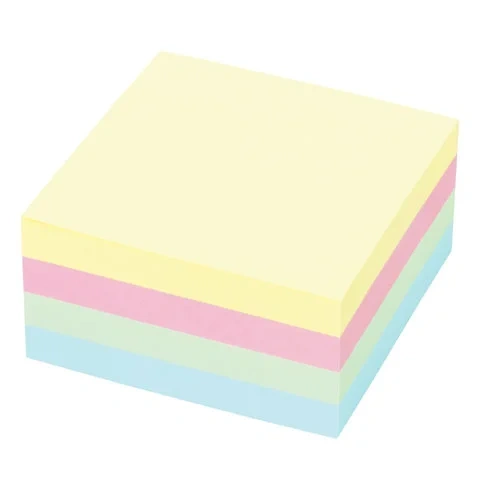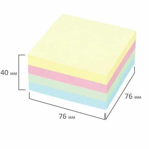 Стикеры 4 пастельных цветов (желтый, розовый, зелёный, голубой) в форме куба 76х76 мм состоят из 400 листов. Плотность бумаги составляет 75 г/м2. Клейкий слой - 22 Н/м. Легко клеятся к любой поверхности. Не оставляют следов. Упакованы в полиэтиленовую пленку.