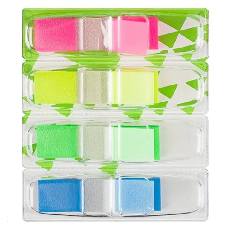 Одну закладку можно использовать несколько раз. Размер одной закладки 12×45 мм. На закладках можно писать ручкой, чернографитовым карандашом, маркером, фломастером. В упаковке 4 ярких неоновых цвета по 35 листов каждого цвета.