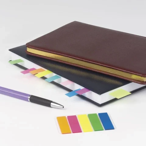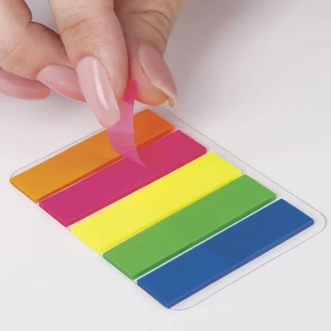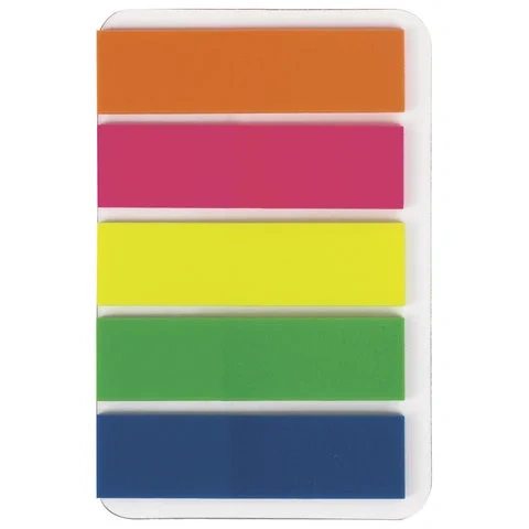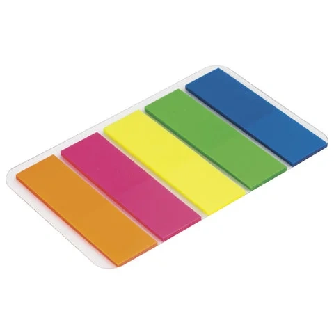 Набор пластиковых закладок 5 неоновых цветов размером 45х12 мм состоит из 100 листов, по 20 закладок каждого цвета. Клейкий слой - 22 Н/м. Легко клеятся к любой поверхности и не оставляют следов. Материал закладок позволяет делать надписи ручкой и карандашом. Уложены на пластиковом основании. Поставляются в полиэтиленовом пакете с европодвесом.