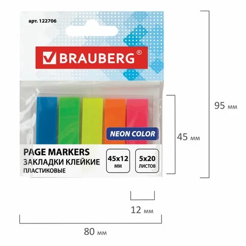 Клейкие закладки пластиковые Brauberg 12х45мм, 5цвета по 20 листов