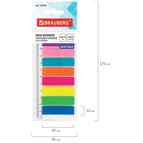 Клейкие закладки пластиковые Brauberg 45х12мм, 8цветов по 25 листов, на пластиковой линейке 12см