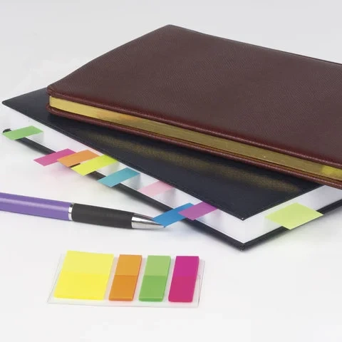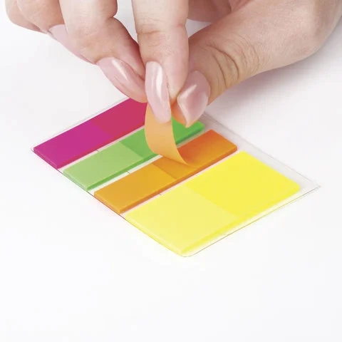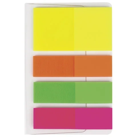 Набор пластиковых закладок 4 неоновых цветов размером 45х12 мм и 45х26 мм состоит из 100 листов, по 25 закладок каждого цвета. Клейкий слой - 22 Н/м. Легко клеятся к любой поверхности и не оставляют следов. Материал закладок позволяет делать надписи ручкой и карандашом. Поставляются в полиэтиленовом пакете с европодвесом.