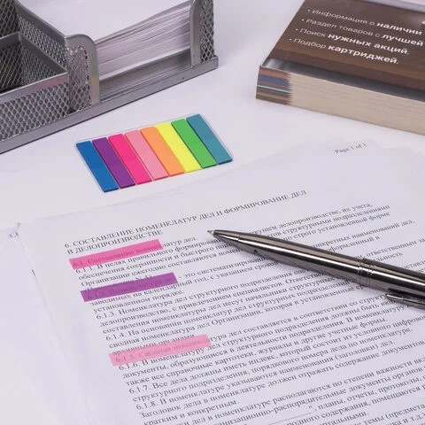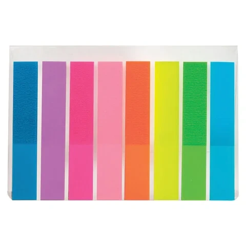 Набор пластиковых закладок 8 неоновых цветов размером 45х8 мм состоит из 160 листов, по 20 закладок каждого цвета. Клейкий слой - 22 Н/м. Легко клеятся к любой поверхности и не оставляют следов. Материал закладок позволяет делать надписи ручкой и карандашом. Уложены на пластиковом основании. Поставляются в полиэтиленовом пакете с европодвесом.