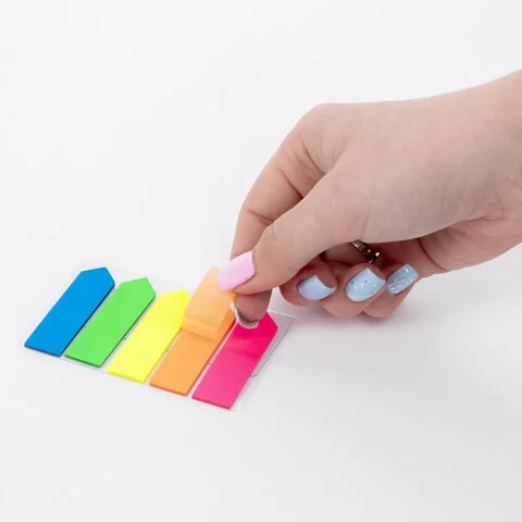 Набор пластиковых закладок 5 неоновых цветов размером 50х14 мм состоит из 125 листов, по 25 закладок каждого цвета. Клейкий слой - 22 Н/м. Легко клеятся к любой поверхности и не оставляют следов. Материал закладок позволяет делать надписи ручкой и карандашом. Уложены на пластиковом основании. Поставляются в полиэтиленовом пакете с европодвесом.