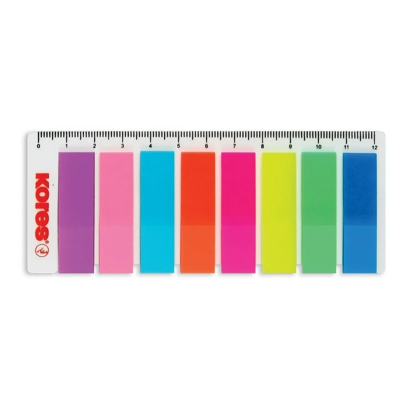 Пластиковые клейкие закладки Kores. Закладки клейкие, ширина которых составляет 12 мм, могут служить закладками в документах, использоваться для записи краткой информации, для выделения текста. Яркие неоновые цвета закладок акцентируют Ваше внимание на нужном моменте в документе или тексте.