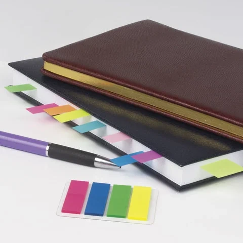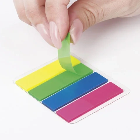Набор пластиковых закладок 4 неоновых цветов размером 45х12 мм состоит из 100 листов, по 25 закладок каждого цвета. Клейкий слой - 22 Н/м. Легко клеятся к любой поверхности и не оставляют следов. Материал закладок позволяет делать надписи ручкой и карандашом. Уложены на пластиковом основании. Поставляются в полиэтиленовом пакете с европодвесом.