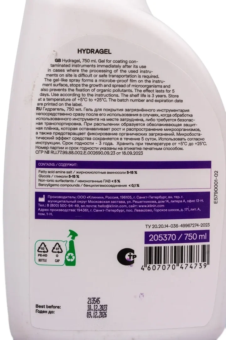 Дезинфицирующее средство Klinin Hydragel 750мл, для предварительной обработки инструментов
