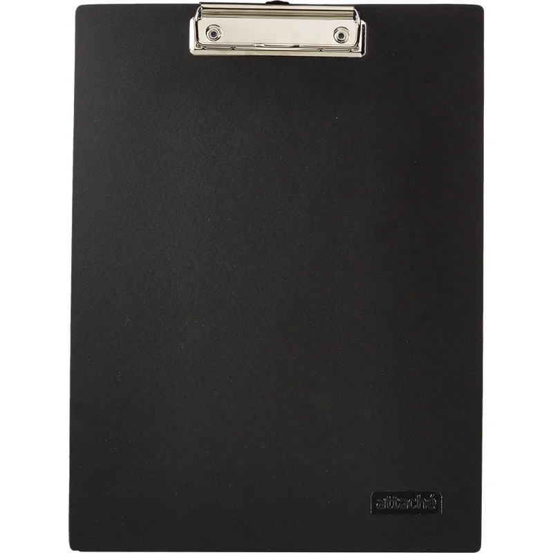 Папка-планшет Attache формата А4 (235×315 мм) изготовлена из плотного пластика (полипропилена) черного цвета. Толщина материала — 1,2 мм. Позволяет комфортно работать с документами на весу. Металлический прижим надежно удерживает листы и файлы. Справа внизу со стороны зажима есть логотип.