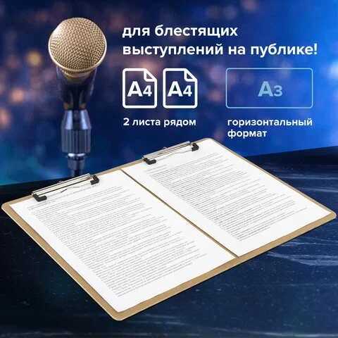 Доска-планшет формата А3 с верхними прижимами без крышки фиксирует до 90 листов. Изготовлена из МДФ материала толщиной 3 мм, что позволяет комфортно делать записи на весу. Металлические прижимы обеспечивают плотное прилегание документов, а выдвижные подвесы позволяют разместить планшет на вертикальной поверхности.