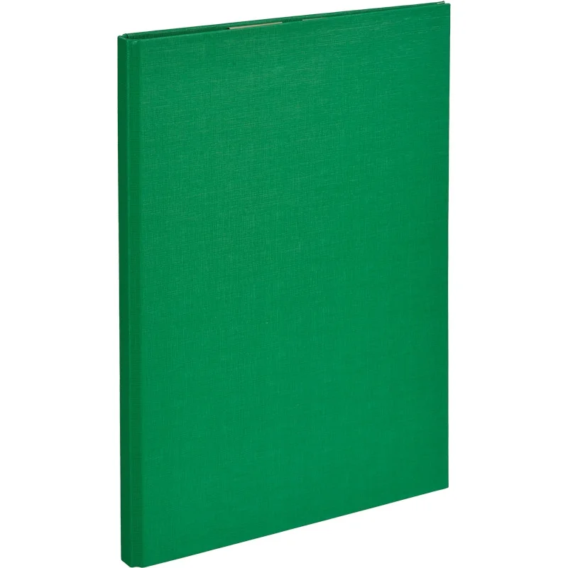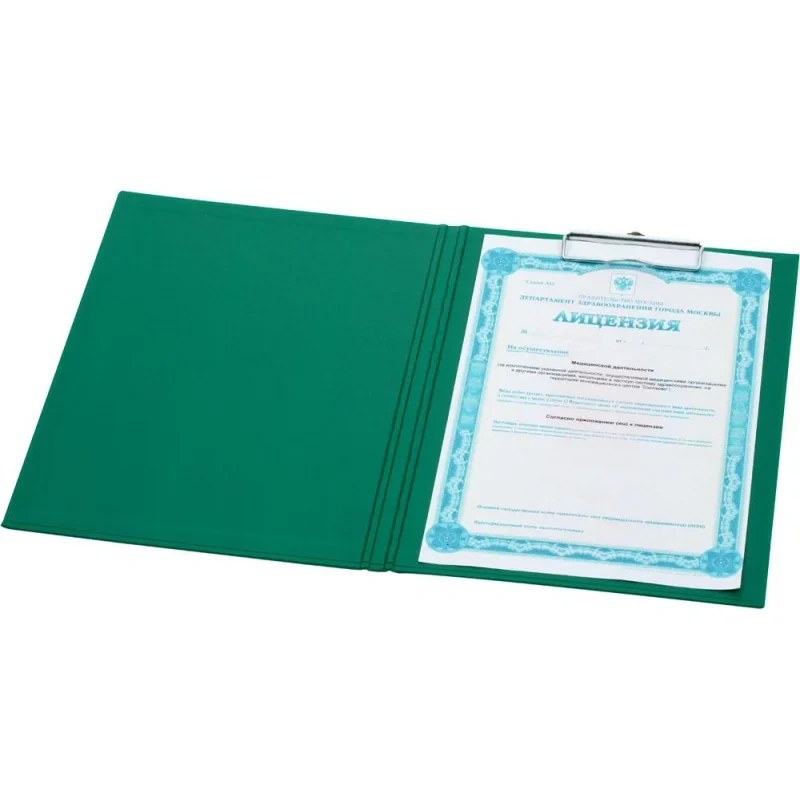 Папка-планшет формата А4 (227.5×314 мм) изготовлена из плотного картона,сверху покрыт бумвинилом зеленого цвета. Позволяет комфортно работать с документами на весу. Металлический прижим надежно удерживает листы и файлы. Вместимость до 100 листов. С крышкой.