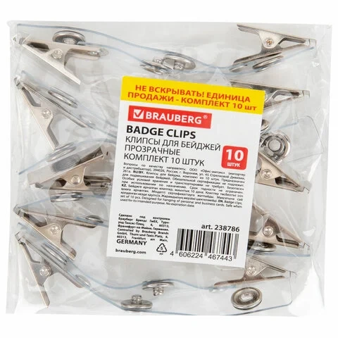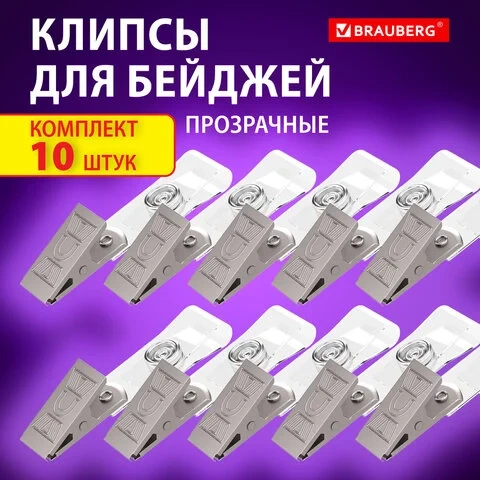 Клипсы для бейджей прозрачные, КОМПЛЕКТ 10 штук, BRAUBERG, 238786