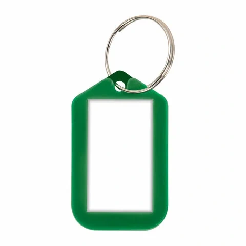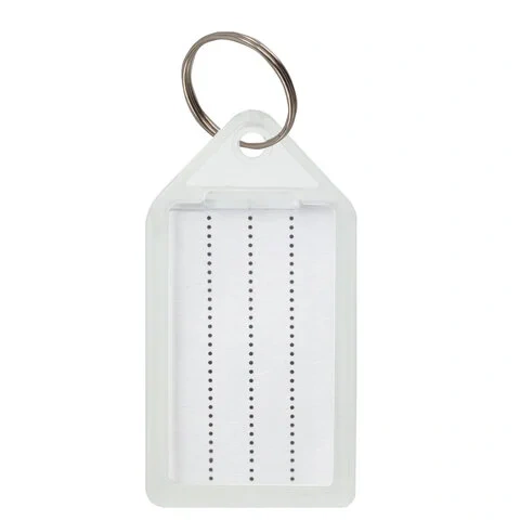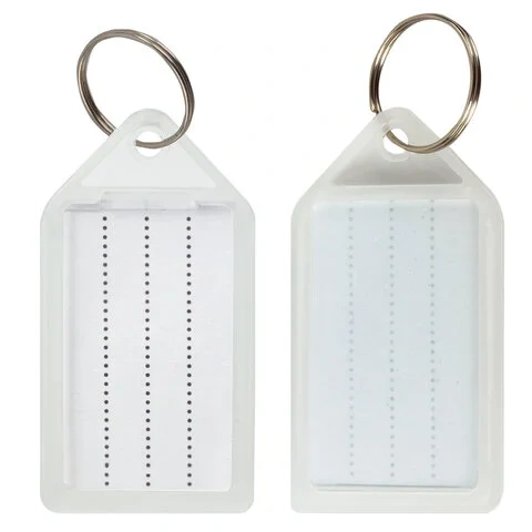 Пластиковая бирка для ключей с металлическим колечком. Бумажная этикетка, зафиксированная в рамке, з...