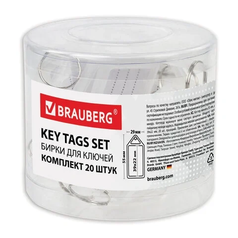 Бирки для ключей Brauberg прозрачные, 20шт, длина 55 мм, инфо-окно 39х22 мм