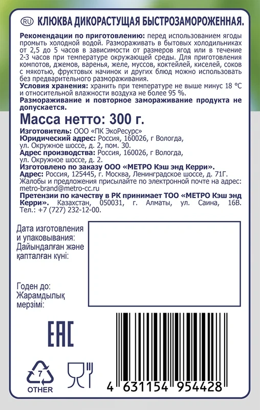 METRO Chef Клюква дикорастущая быстрозамороженная, 300г