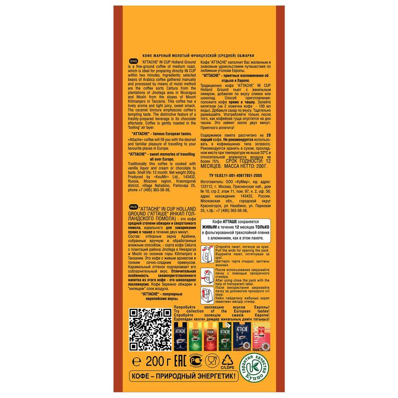 Кофе Attache In Cup Голландского помола — это кофе средней степени обжарки и сверхтонкого помола, идеального для заваривания прямо в чашке в течение двух минут. Состав: отборные зерна Арабики собранные вручную и обработанные влажным способом — сорта кофе Cattura с плантаций района Jinotega в Никарагуа и Moshi со склонов горы Kilimanjaro в Танзании. Это кофе с живым ароматом и тонким сочно-сладким вкусом. Карамельный оттенок подчеркивает его соблазнительный вкус. Отличительная особенность свежеприготовленного напитка из этого кофе — это шоколадное послевкусие. Кофе бережно обжарен в «кипящем» слое воздуха. Кофе Attache In Cup Holland Ground пьют с ванильным ликером, добавляя по вкусу сливки или шоколад.