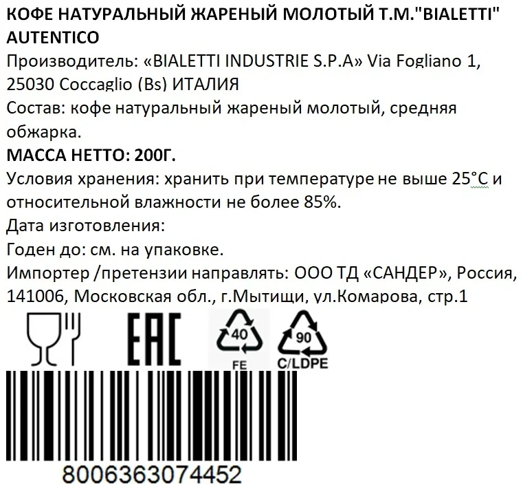 Отзывы о «Кофе Bialetti Autentico молотый, 200г»