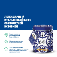Кофе хранится в изысканной жестяной коробке с декором, вдохновленным сицилийской майоликой. Такой дизайн делает упаковку стильной и привлекательной, подчеркивая качество продукта и его средиземноморское происхождение.