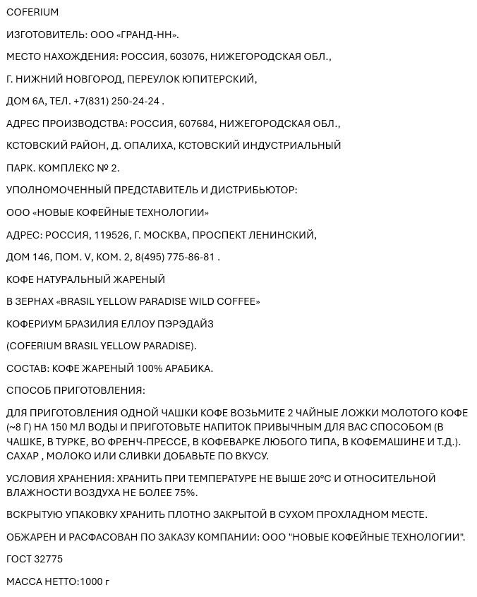 Кофе Coferium Brasil Yellow Paradise зерновой, 1кг