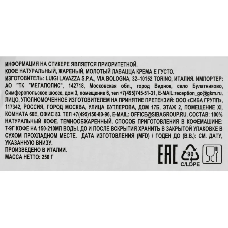 Кофе молотый Lavazza Crema e Gusto 250г, пачка