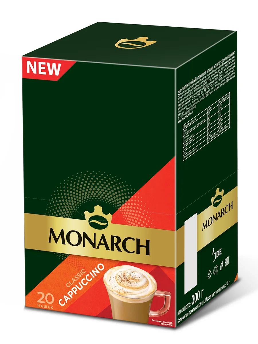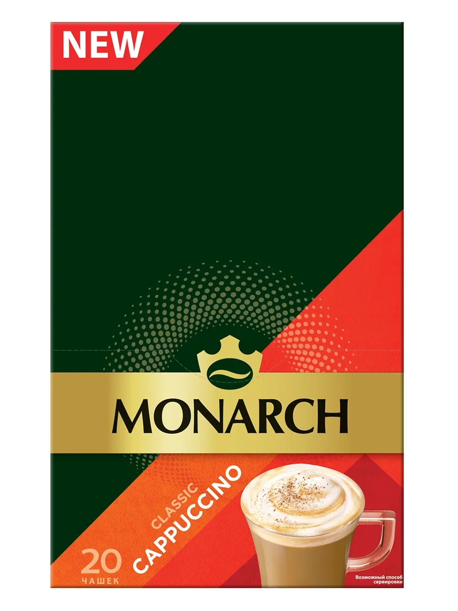Богатый, насыщенный вкус и волшебная сила Аромагии остаются с вами в каждой чашке кофе Monarch. Сохраняется высокое качество и традиции производства, чтобы вы всегда могли наслаждаться любимым кофе. Monarch Cappuccino - насыщенный вкус капучино с высокой пенкой. Для его изготовления использовались тщательно отобранные кофейные зерна, которые прошли особую обработку, позволившую сохранить аромат и вкус. Сливочный вкус этого бодрящего напитка подарит отличное настроение на весь день.