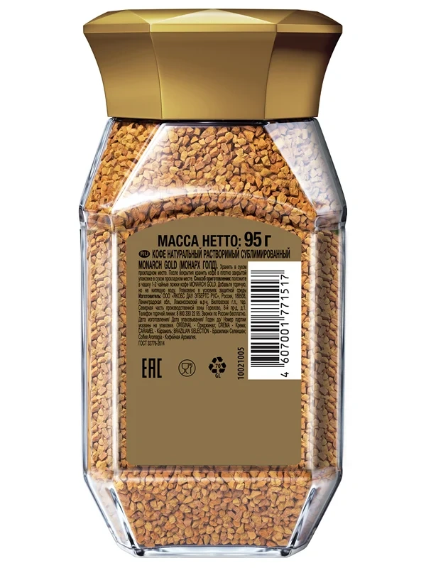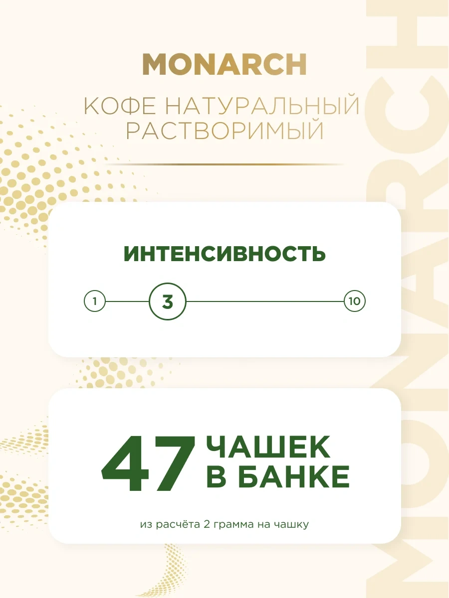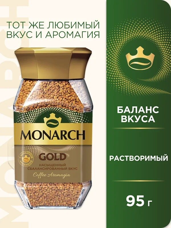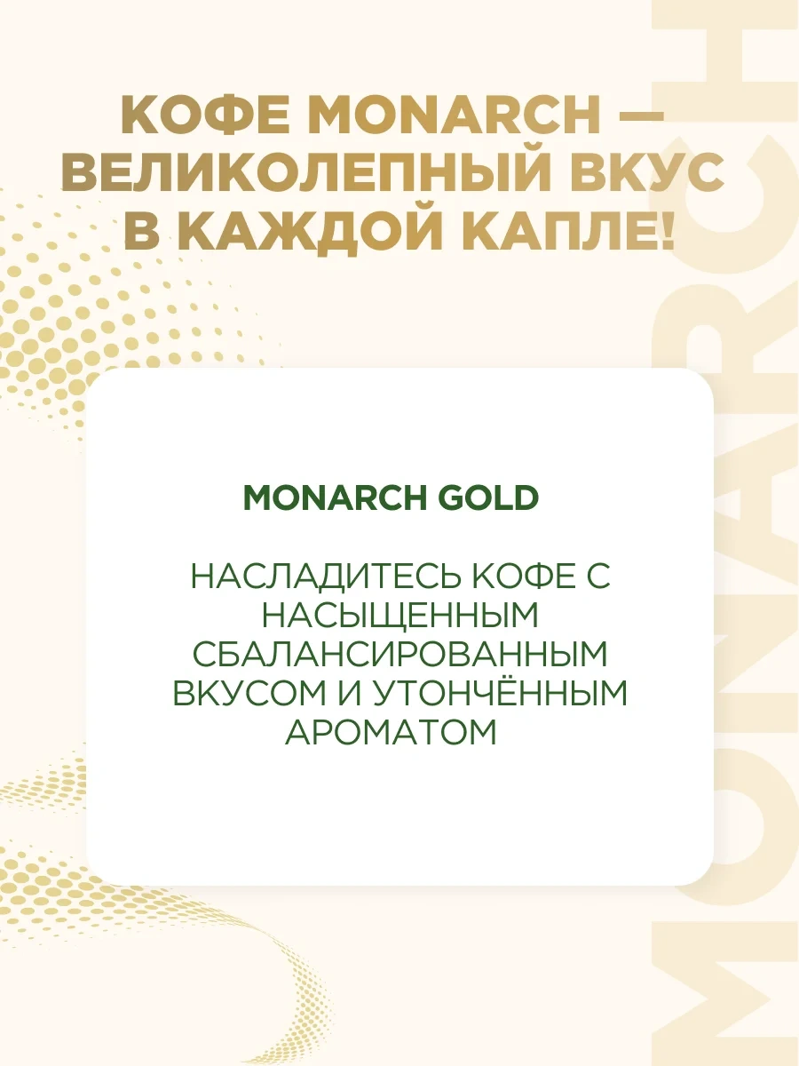 Кофе растворимый сублимированный Monarch Gold 95 г (стеклянная банка) создан из специально отобранных зерен арабики мягкой обжарки. Благодаря этому напиток обладает насыщенным, сбалансированным вкусом и утонченным ароматом.