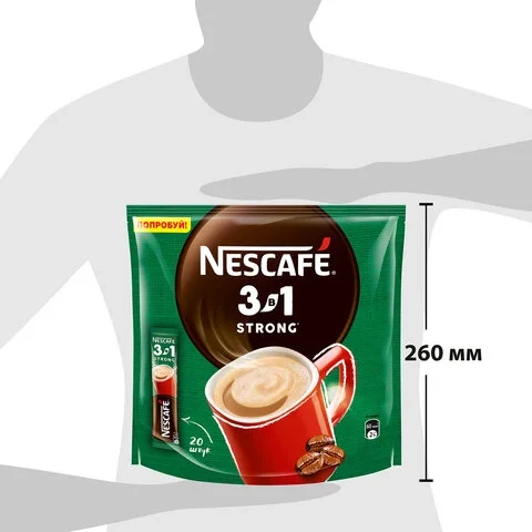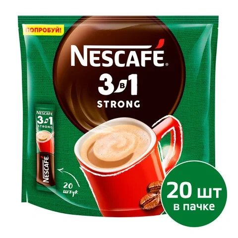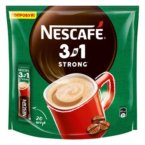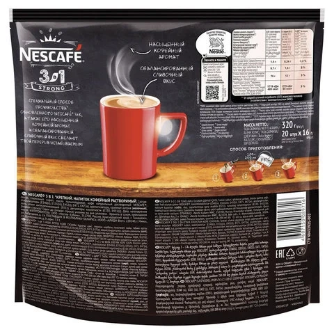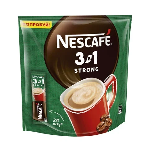 Откройте для себя насыщенный кофейный аромат и сбалансированный сливочный вкус кофейного напитка Нескафе 3 в 1 Крепкий.