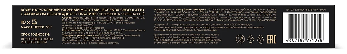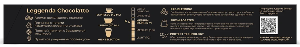 Кофе в капсулах Poetti Leggenda Chocolatto для кофемашин Nespresso 10шт, 53г x 12 шт из новой линейки Poetti Barrista blends гарантирует Вам изысканный и гармоничный вкус кофе в каждой чашке для истинного момента наслаждения. Кофе герметично упакован в алюминиевую капсулу, которая бережно сохраняет восхитительный вкус и аромат кофе. Аромат шоколадного пралине с горчинкой с нотами карамелизированного сахара. Плотный напиток с бархатистой текстурой. Приятное умеренное послевкусие.