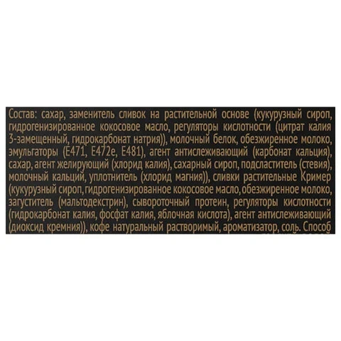 Состав: сахар, заменитель сливок на растительной основе, кофе натуральный растворимый, ароматизатор 'Карамель', соль.