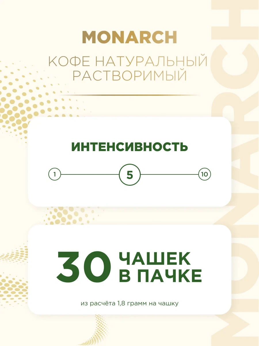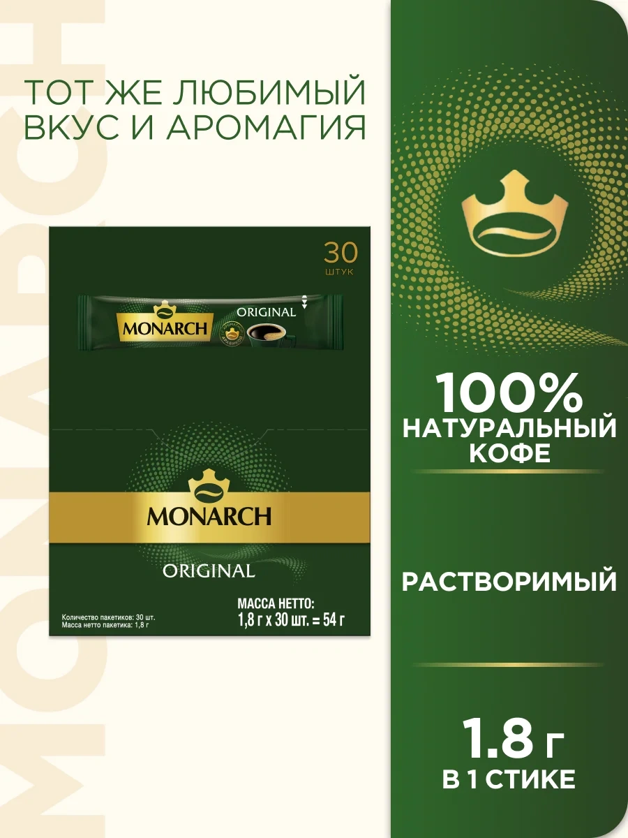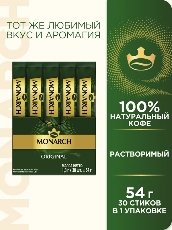 Растворимый кофе; сублимированный, натуральный без сахара. Богатый, насыщенный вкус и волшебная сила аромагии остаются с вами в каждой чашке кофе Monarch. Мы сохраняем высокое качество и традиции производства, чтобы вы всегда могли наслаждаться любимым кофе. Кофе Monarch Original — великолепный вкус в каждой капле. Легко и быстро растворяется в горячей, но не кипящей воде. Компактная порционная упаковка надёжно сохраняет его свойства, текстуру и свежесть.