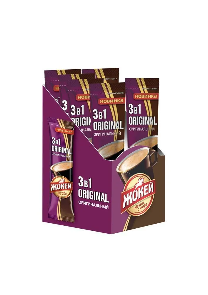 Кофе порционный 3в1 Жокей 'Оригинальный' — это растворимый кофе с классическим сочетанием сахара и сливок.