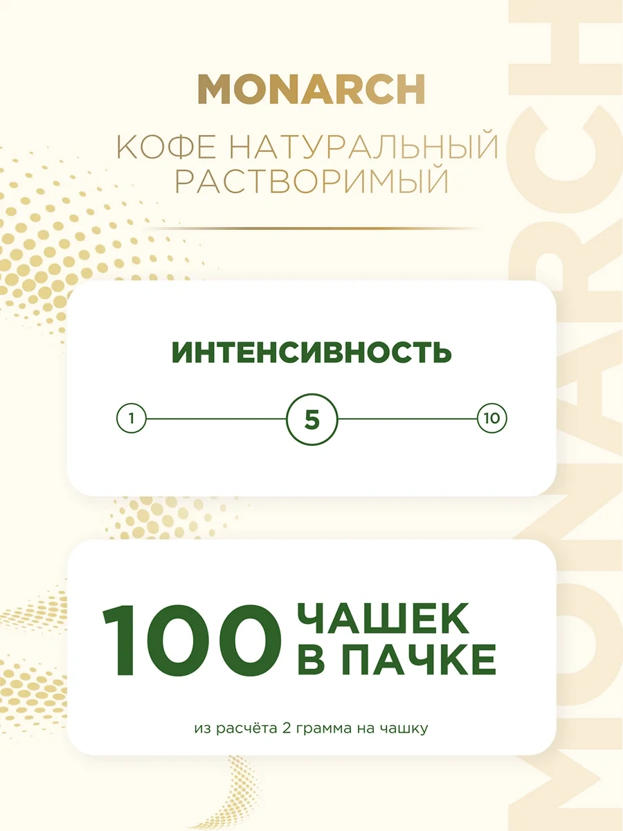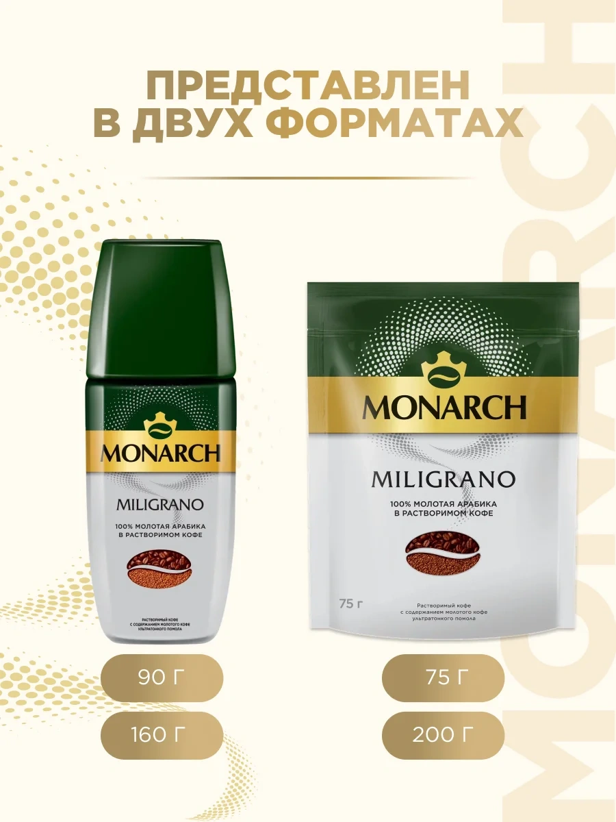 Кофе растворимый сублимированный Monarch Miligrano 200 г (пакет) изготовлен по эксклюзивной технологии, которая объединяет натуральный растворимый сублимированный кофе и жареный молотый сорта 100 % арабика. Это позволяет получать насыщенный вкус и аромат внутри каждой чашки. Тонкий помол молотой арабики придает напитку особую крепость и глубину вкуса. Для приготовления достаточно положить в чашку 1-2 чайные ложки кофе и залить горячей, но не кипящей водой.