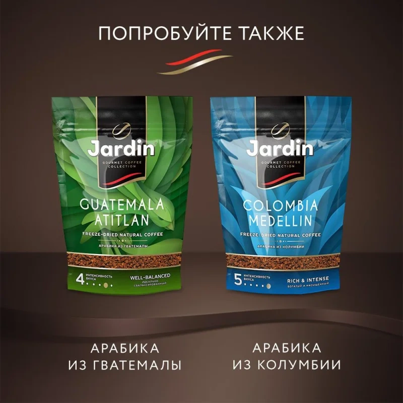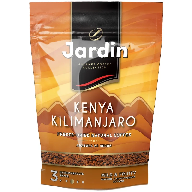 Кофе растворимый сублимированный Jardin Kenya Kilimanjaro 150 г (пакет) — это высококачественный продукт, основанный на кенийской арабике. Этот кофе в пакетах сублимирован, поэтому в нем сохранен натуральный вкус. Он обладает искрящимся цитрусовым ароматом с ягодным послевкусием. Интенсивность — мягкая, 3 из 5. Фруктовые ноты раскрываются особенно ярко при добавлении молока.