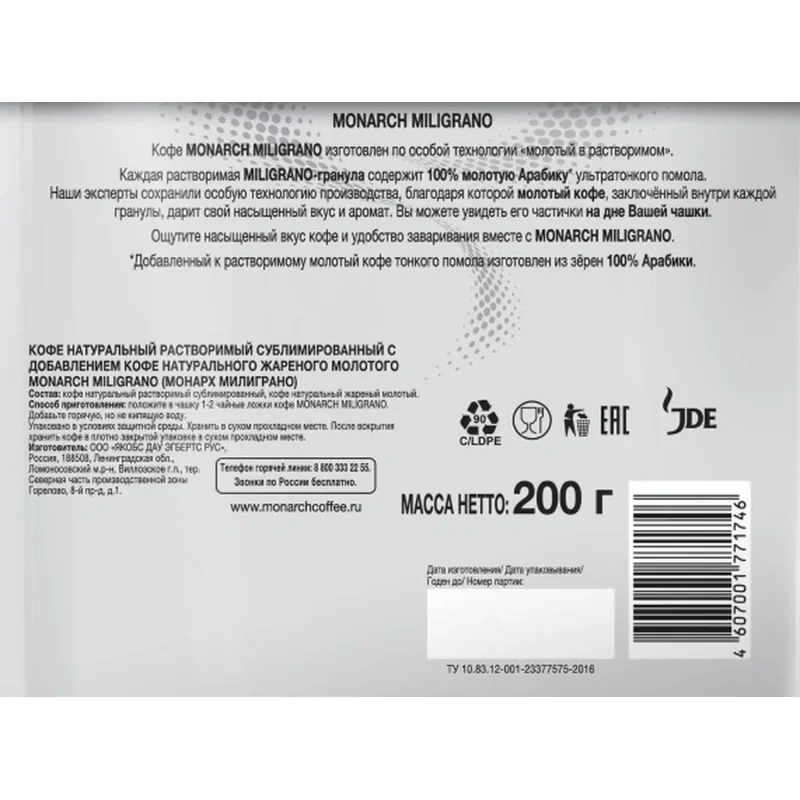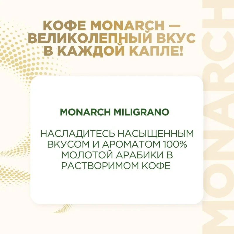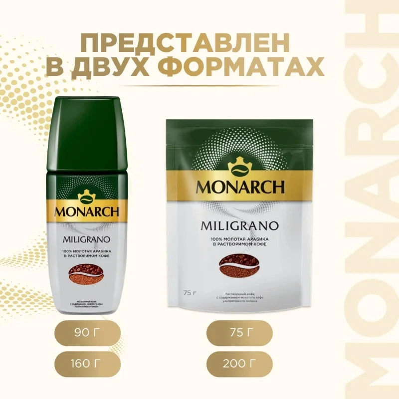 Кофе растворимый сублимированный Monarch Miligrano 200 г (пакет) изготовлен по эксклюзивной технологии, которая объединяет натуральный растворимый сублимированный кофе и жареный молотый сорта 100 % арабика. Это позволяет получать насыщенный вкус и аромат внутри каждой чашки. Тонкий помол молотой арабики придает напитку особую крепость и глубину вкуса. Для приготовления достаточно положить в чашку 1-2 чайные ложки кофе и залить горячей, но не кипящей водой.