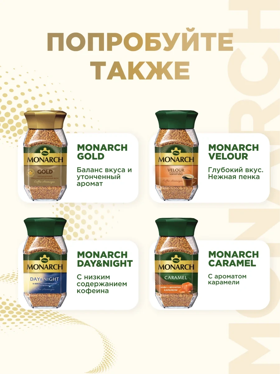 Кофе Monarch Original растворимый, 500г обладает богатым, классическим вкусом и притягательным ароматом, благодаря искусному сочетанию отборных кофейных зерен и глубокой обжарке. Является наиболее популярным кофе в линейке Jacobs. Приготовлен по современной технологии freeze-dried-сушкой замораживанием. Богатый насыщенный вкус и аромат подарит удовольствие ценителям кофейных напитков с первого глотка. В благородной теплоте тщательно обжаренных зерен скрывается секрет подлинной крепости и притягательного аромата кофе растворимый Jacobs Monarch.