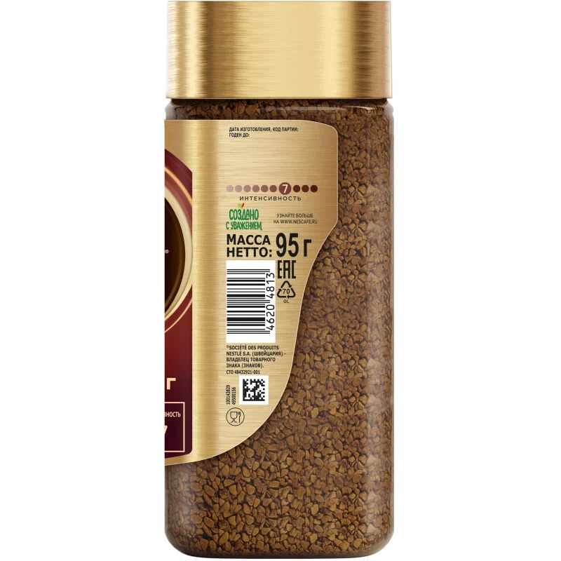 Кофе растворимый Nescafe Gold 95 г (стеклянная банка) - идеальный вариант для настоящих ценителей натурального кофе. Вам точно придется по душе глубокий аромат и многогранный вкус Nescafe Gold. Благодаря тончайшему помолу зерен арабики становится возможным особое звучание деликатных кофейных ноток. Чтобы создать сублимированный кофе Nescafe Gold, эксперты отбирают первоклассные зерна арабики и робусты, затем бережно обжаривают их до оптимальной степени. Это позволяет раскрыть благородный вкус и глубокий аромат, которые дарит каждая приготовленная чашка. Растворимый кофе Nescafe Gold дает возможность настроиться на продуктивный рабочий день с утра, сделать паузу между встречами днем и открыть в себе второе дыхание для завершения дел под вечер. В какое бы время вы не приготовили себе кружку ароматного напитка, будьте уверены в удовольствии и необходимой энергии, которые вам обеспечены. Кофе в стеклянной банке объемом 95 грамм - удобный формат для небольшого офиса.Условия хранения: хранить в сухом, прохладном месте.Состав: натуральный растворимый сублимированный кофе, натуральный жареный молотый кофе.Способ приготовления: шаг 1. Добавьте 2 чайной ложки кофе в чашку. Шаг 2. Залейте горячей, но не кипящей водой. Шаг 3. По желанию можно добавить сахар, молоко или сливки.