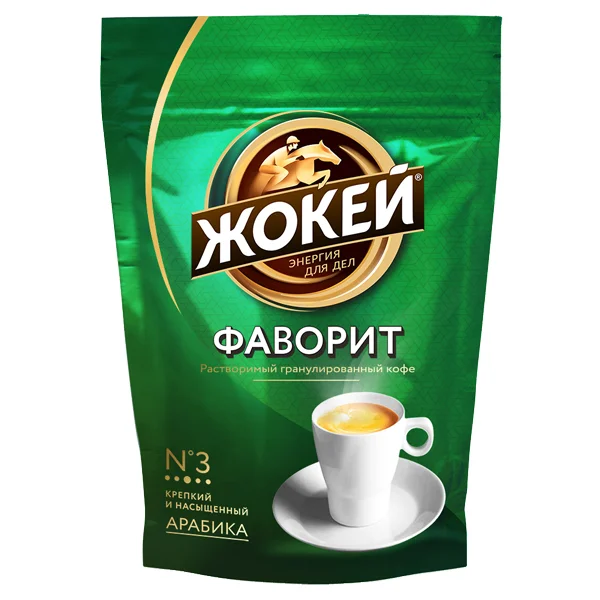 Гранулированный растворимый кофе Жокей Фаворит — пример гармоничного сочетания настоящей крепости, насыщенности и яркого аромата.