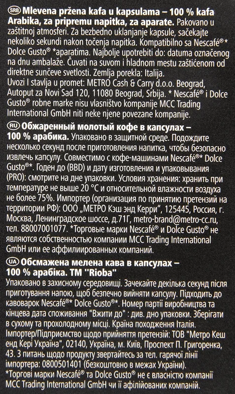 Кофе в капсулах Rioba Dolce Gusto Americano имеет среднюю степень обжарки. Готовый напиток обладает ярким, выраженным вкусом, который невозможно спутать ни с каким другим. В крепкой, бодрящей арабике прослеживается кислинка, которая придает пикантность. Rioba Dolce Gusto Americano предназначены для капсульной кофеварки. Напиток заряжает энергией, пробуждает жизненные силы и настраивает на продуктивный день. Продукт полностью натуральный, в нем не содержатся искусственные добавки (ароматизаторы, консерванты, усилители вкуса). Капсулы герметично закрыты, за счет чего кофе обеспечивается надежная защита от попадания влаги.