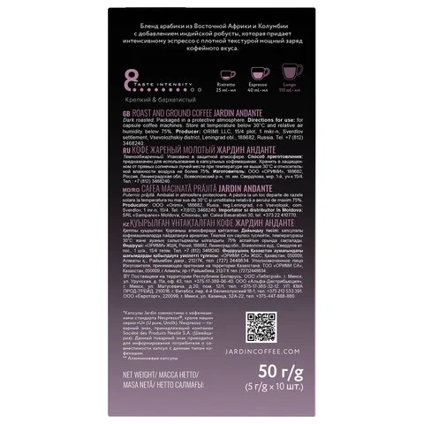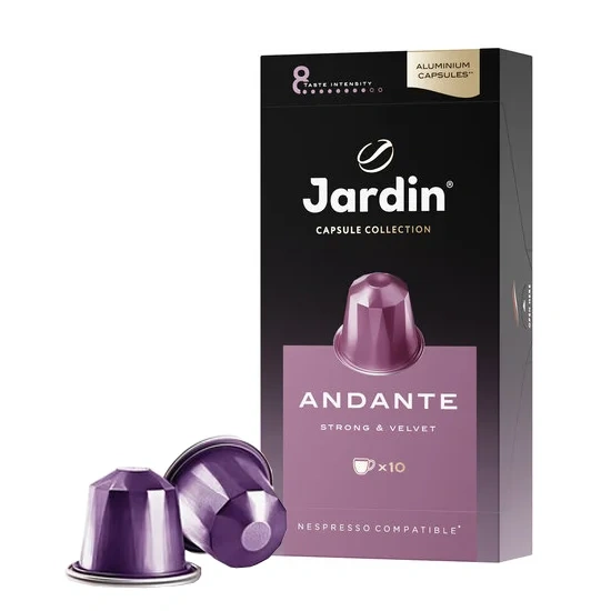 Капсулы для кофемашин Nespresso Jardin Andante - это бленд арабики из Восточной Африки и Колумбии с добавлением индийской робусты. Полнотелый эспрессо, сочетающий в себе бархатную текстуру и приятную сочность высокогорной арабики. Состав: кофе жареный молотый. Степень обжарки: темная. Вид кофе: кофе в капсулах. Способ приготовления: для заваривания в капсульной кофемашине стандарта Nespresso, кроме машин серии U (U Pure, Umilk) . Вес: 50 г (10 капсул). Тип упаковки: картонная коробка. Условия хранения: хранить в защищенном от прямых солнечных лучей месте при температуре не выше 30 С. Страна производства: Россия.