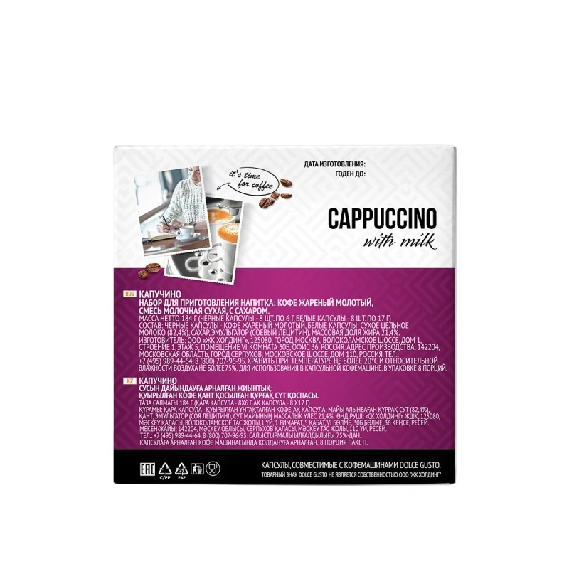 Вес: 184 г (16 капсул: 8 капсул с кофе по 6 г; 8 капсул с молоком по 17 г).