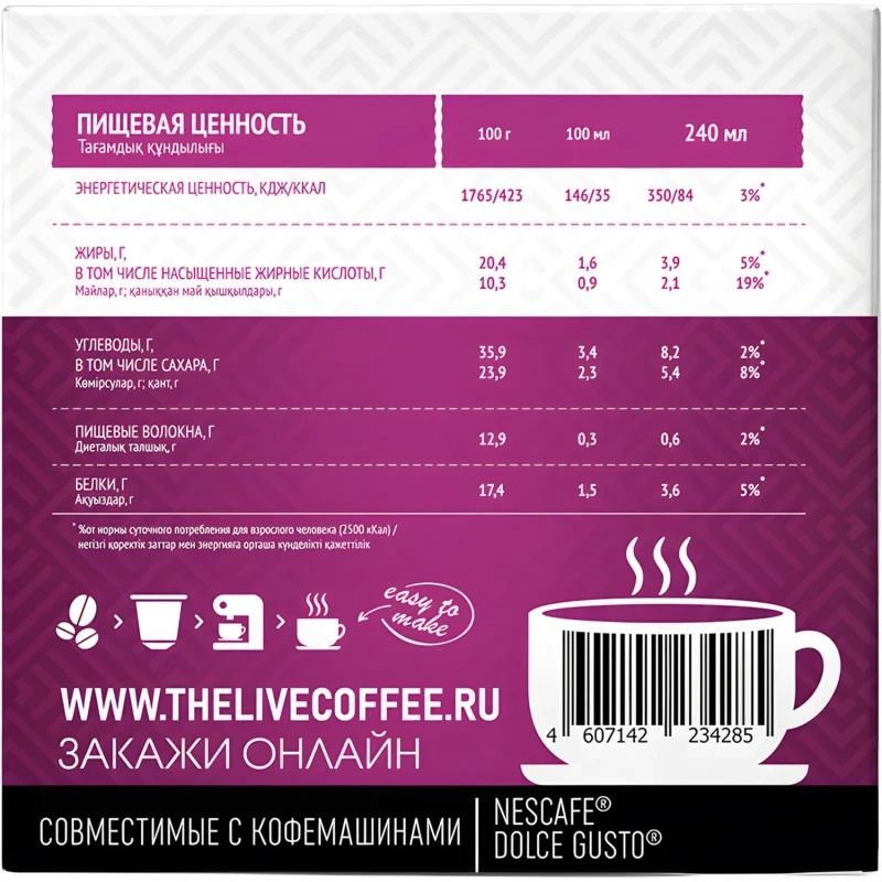 Способ приготовления: для приготовления в капсульной кофемашине стандарта Dolce Gusto.