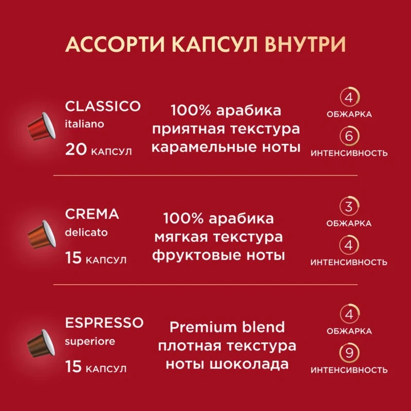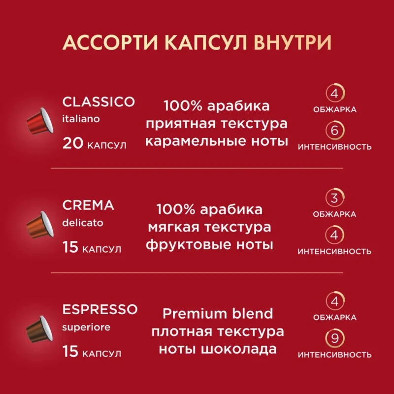 В наборе: Classico Italiano – 20 шт., Espresso Superiore – 15 шт., Crema Delicato – 15 шт.