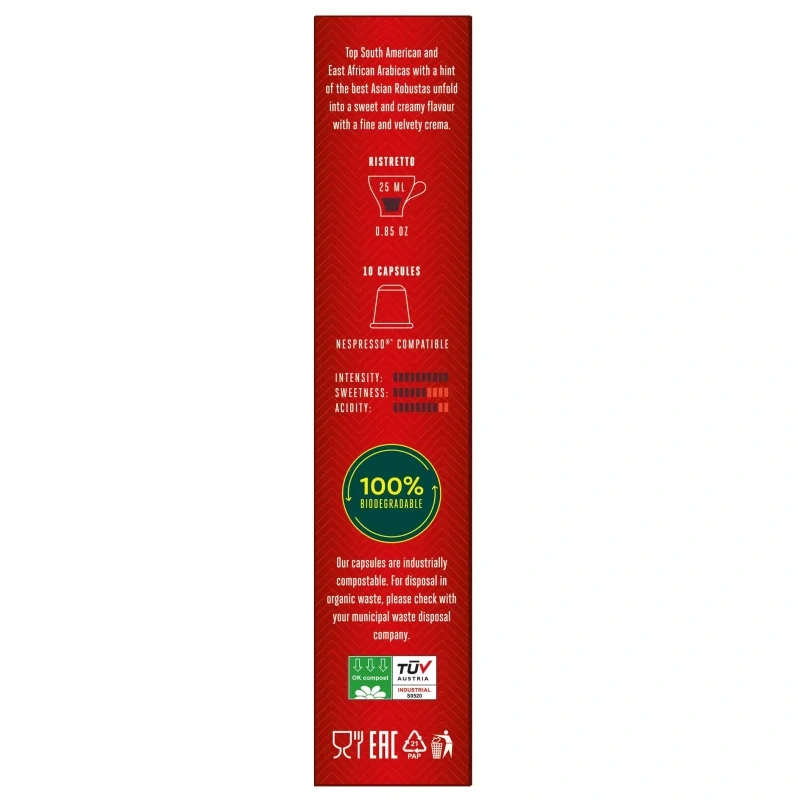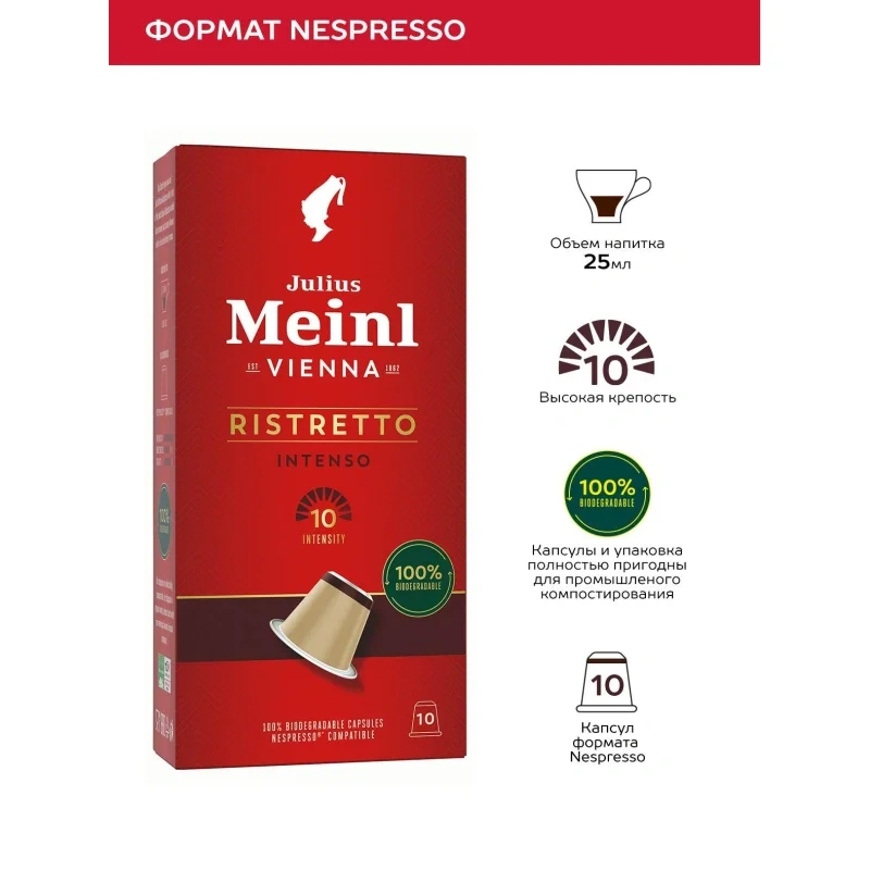 Кофе в капсулах для кофемашин Julius Meinl Ristretto Intenso BIO (10 штук в упаковке). Насладитесь моментом с премиальным кофе Julius Meinl в капсулах для Nespresso. Произведено в Италии. Эксклюзивная смесь вкусных, ароматных сортов арабики из Южной Америки и Восточной Африки, дополненная высококачественными зернами робусты из Азии. Капсулы Юлиус Майнл — это не просто качественный кофе в удобном формате, но и забота об экологии, благодаря 100% биоразлагаемому составу самой капсулы. Дескрипторы вкуса: орех, хлеб. Обжарка — темная, обжарка придает кофе деликатную горчинку и карамельный вкус. При этом данная степень обжарки делает напиток более интенсивным и насыщенным по вкусу, что идеально подходит для приготовления чашки эспрессо, ристретто или лунго в кофейной машине Nespresso. Высокая крепость: 10. Интенсивность вкуса: 10 из 10. Сладость: 6 из 10. Кислотность: 8 из 10. Экологическая ответственность: 100% биоразлагаемые материалы, на основе формованного волокна и биополимера из полимолочной кислоты, надежная защита от разгерметизации.