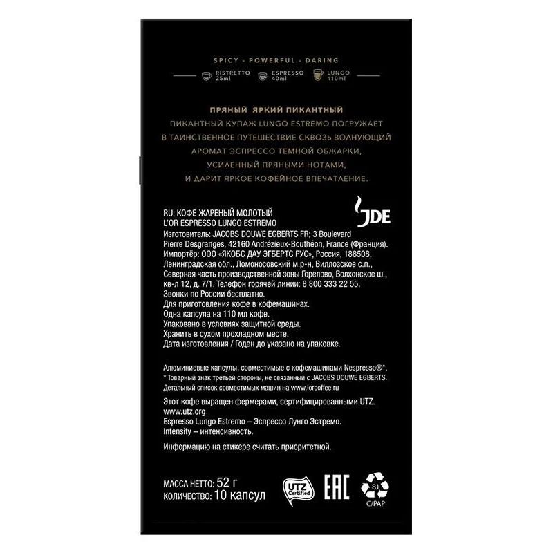 Капсулы L’or Espresso Lungo Estremo для кофемашин Nespresso, 10 штук в упаковке. Пикантный купаж Lungo Estremo погружает в таинственное путешествие сквозь волнующий аромат эспрессо темной обжарки, усиленный пряными нотами, и дарит яркое кофейное впечатление.