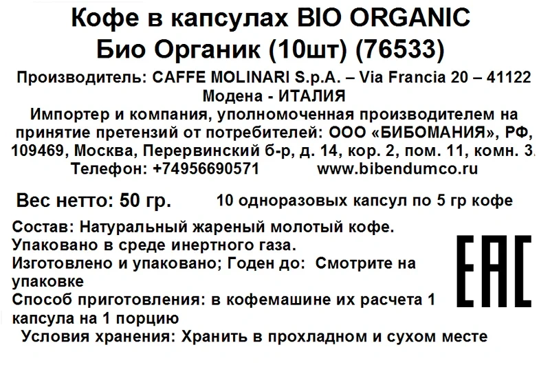 Кофе в капсулах Molinari Bio для кофемашин Nespresso 10шт, 50г