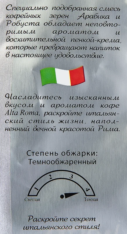 Кофе Alta Roma Espresso в зернах, 1кг – специально подобранная смесь, которая идеально подойдет для приготовления эспрессо традиционным способом, а также будет безупречно гармонировать с молоком. Под торговой маркой Alta Roma Еspresso представлен как натуральный зерновой кофе, так и сублимированный. Благодаря темной обжарке поддерживается идеальное сочетание вкуса и фруктового аромата. Alta Roma Еspresso – это превосходная смесь элитных сортов арабики, которая подарит ценителям свежеобжаренного кофе послевкусие кубинской сигары. Активные антиоксиданты в составе напитка замедляют процессы старения.