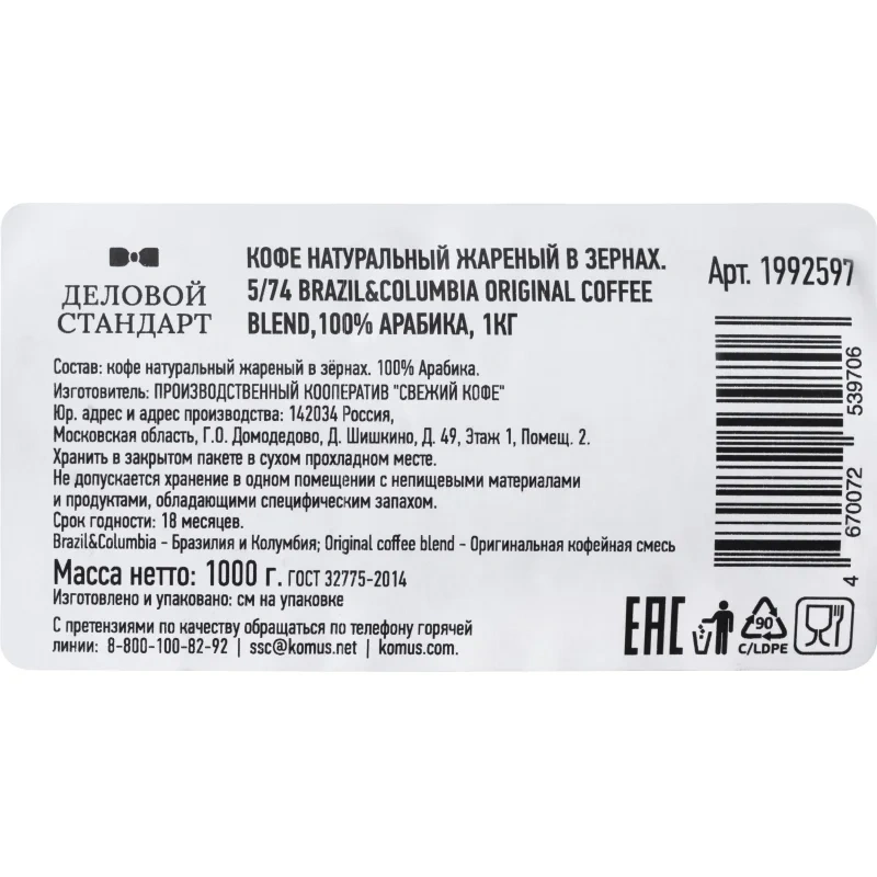 Кофе в зёрнах Деловой Стандарт 5/74 Brazil&Columbia Original coffee blend арабика 100% 1 кг (пакет)